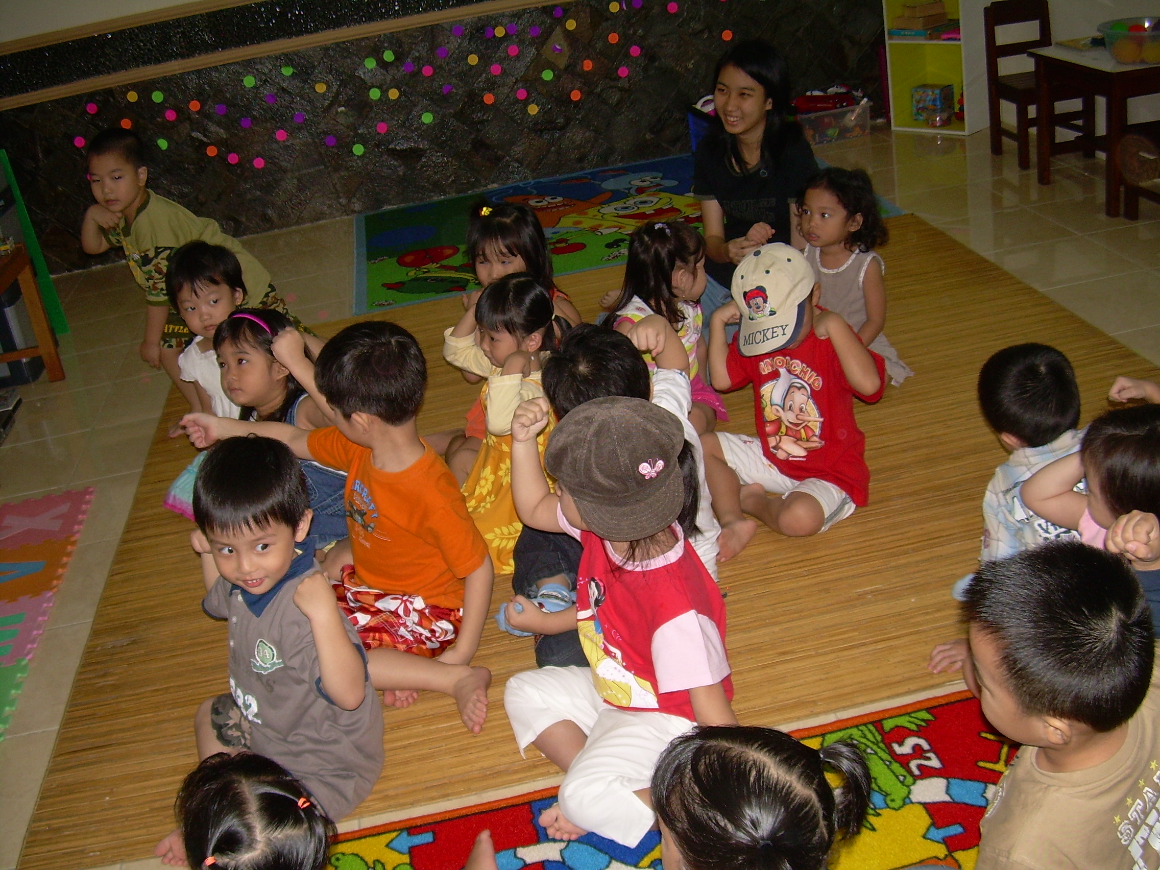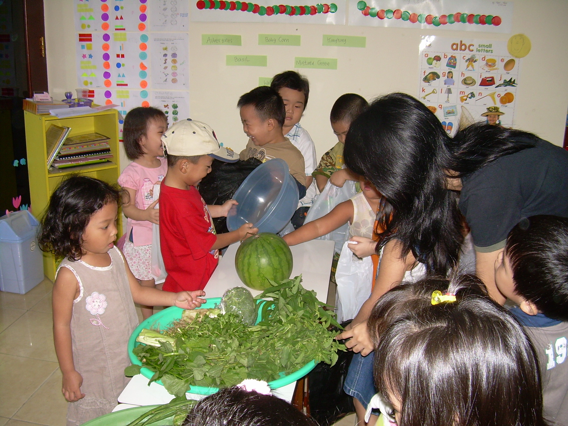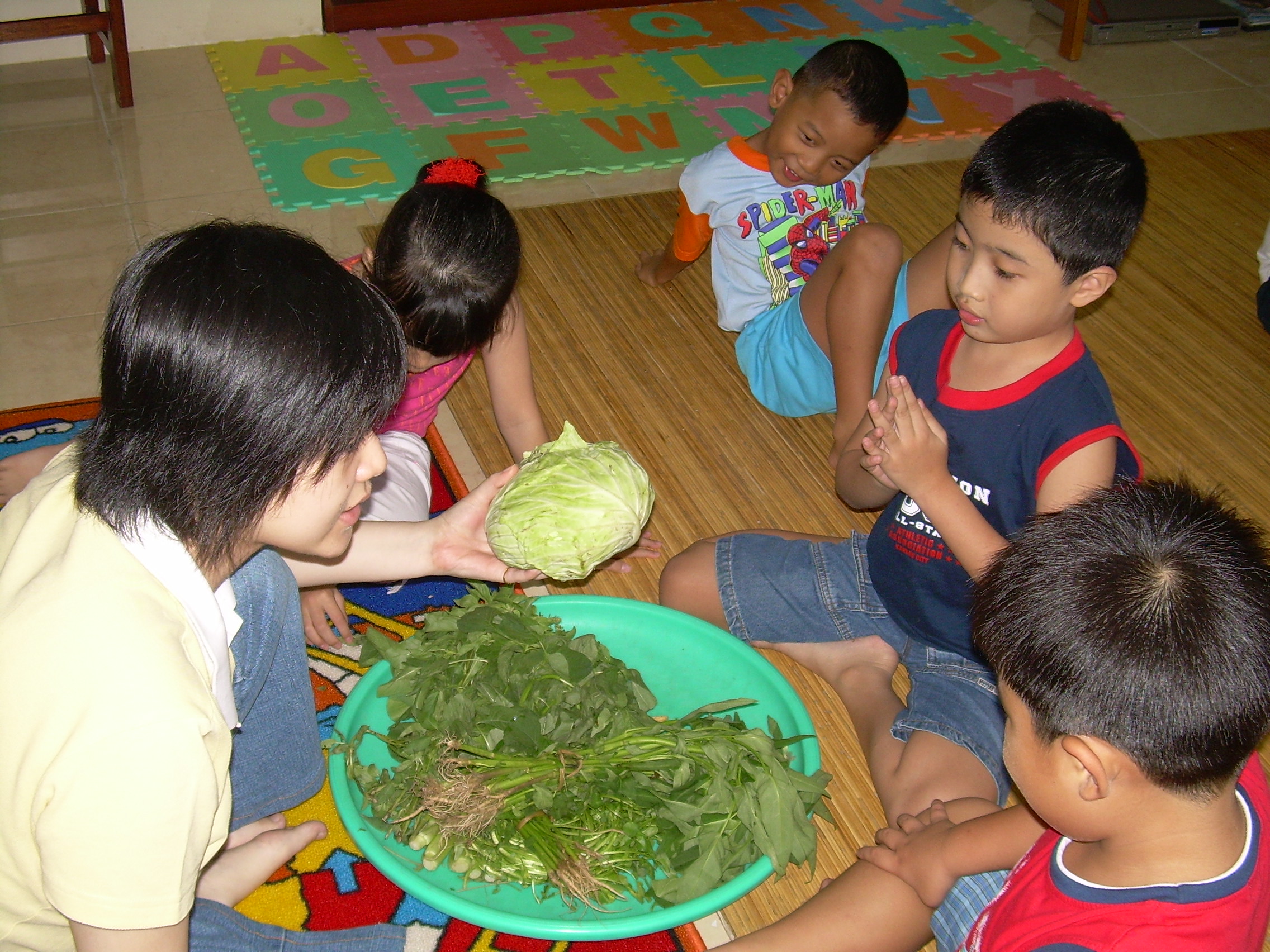 They were amazed to see, touch and smell that lots of veggies. They thought it should be done by their mothers or helpers at home. All they know that veggies were something that not really yummy and tasty. By giving them knowledge about veggies, children will learn the positive sides of eating veggies (see the photo below – when they acted as body builder).